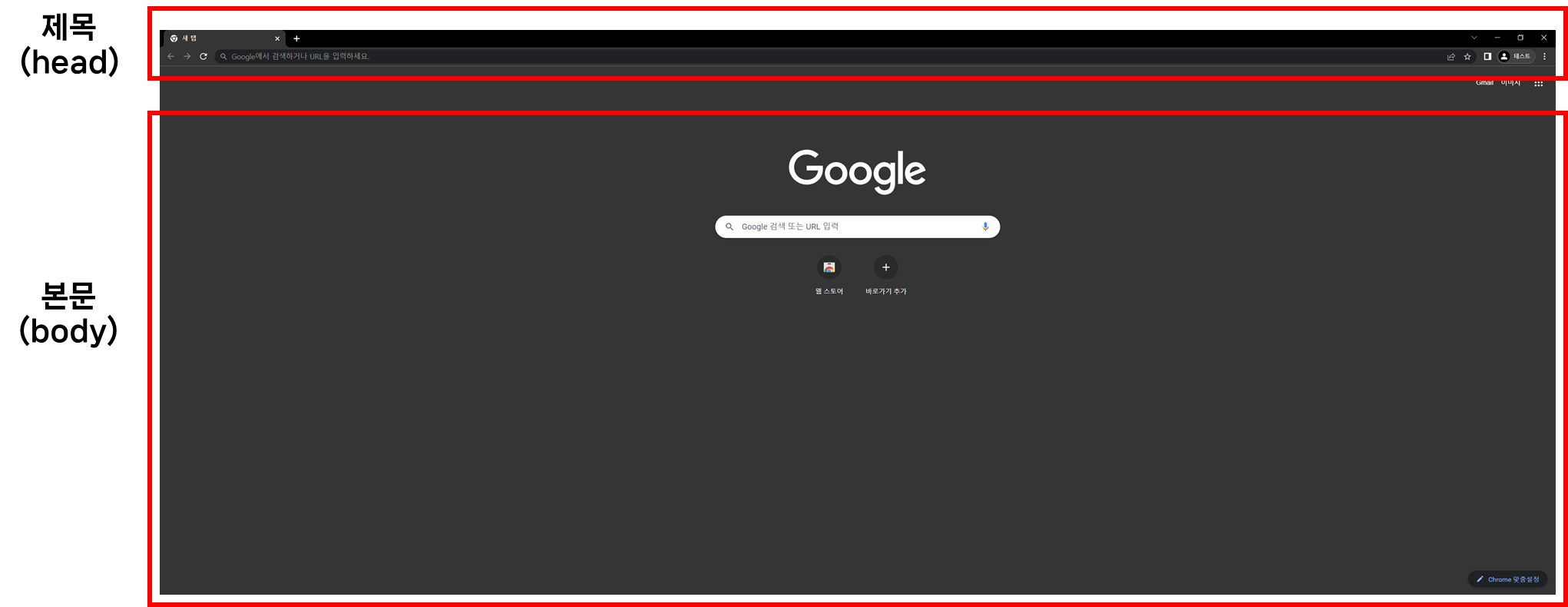 HTML 문서는 제목 <head>와 본문 <body>로 분리되며 HTML 구조로 표현하면 다음과 같다.